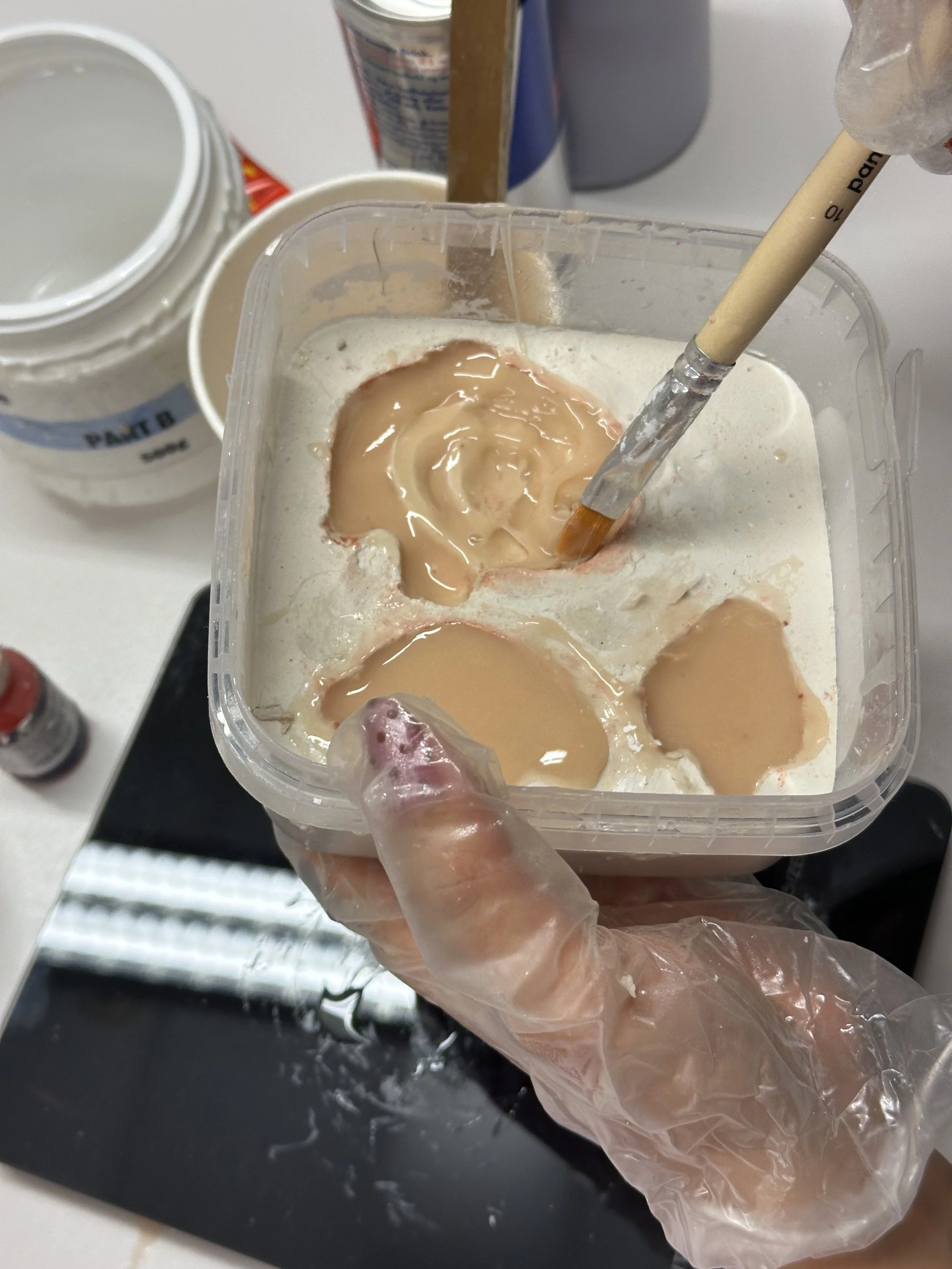 The structure was first shaped with clay and cardboard, before being casted and covered. The flesh was made of silicone and makeup.